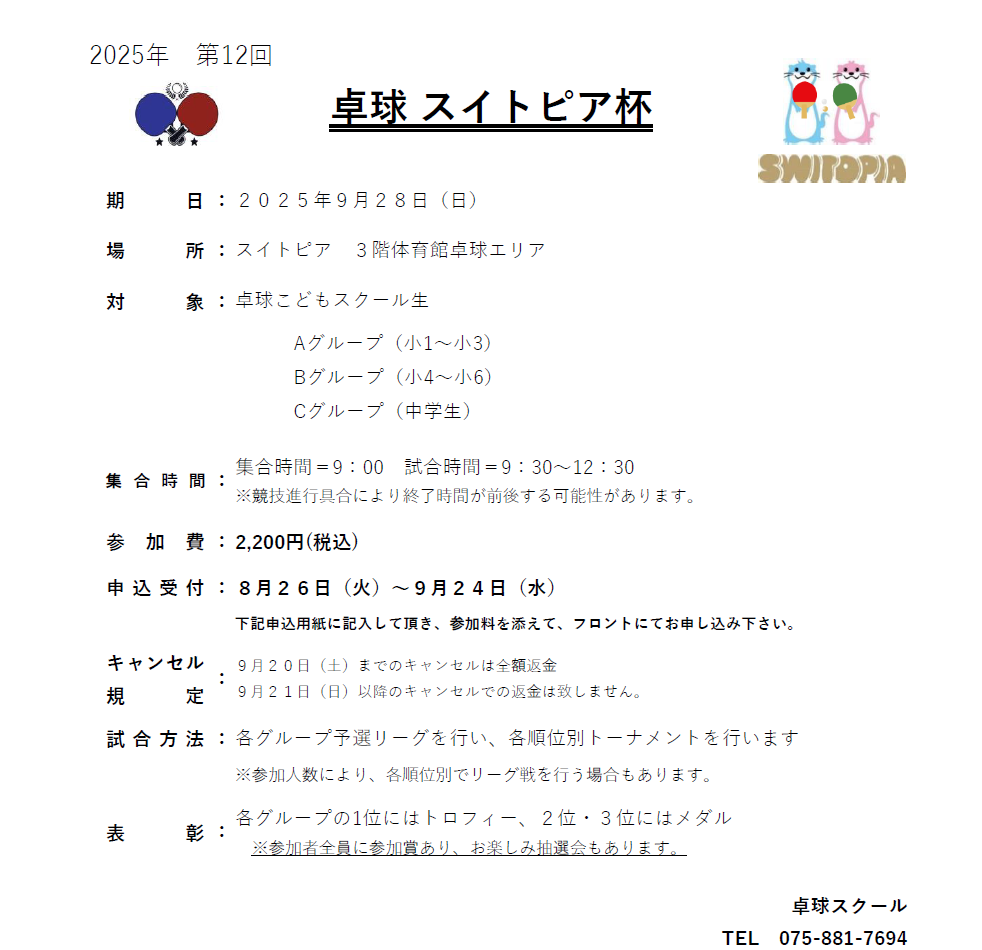 9月28日(日)に行われるスイトピア杯の詳細をお知らせします。ご参加お待ちしております。