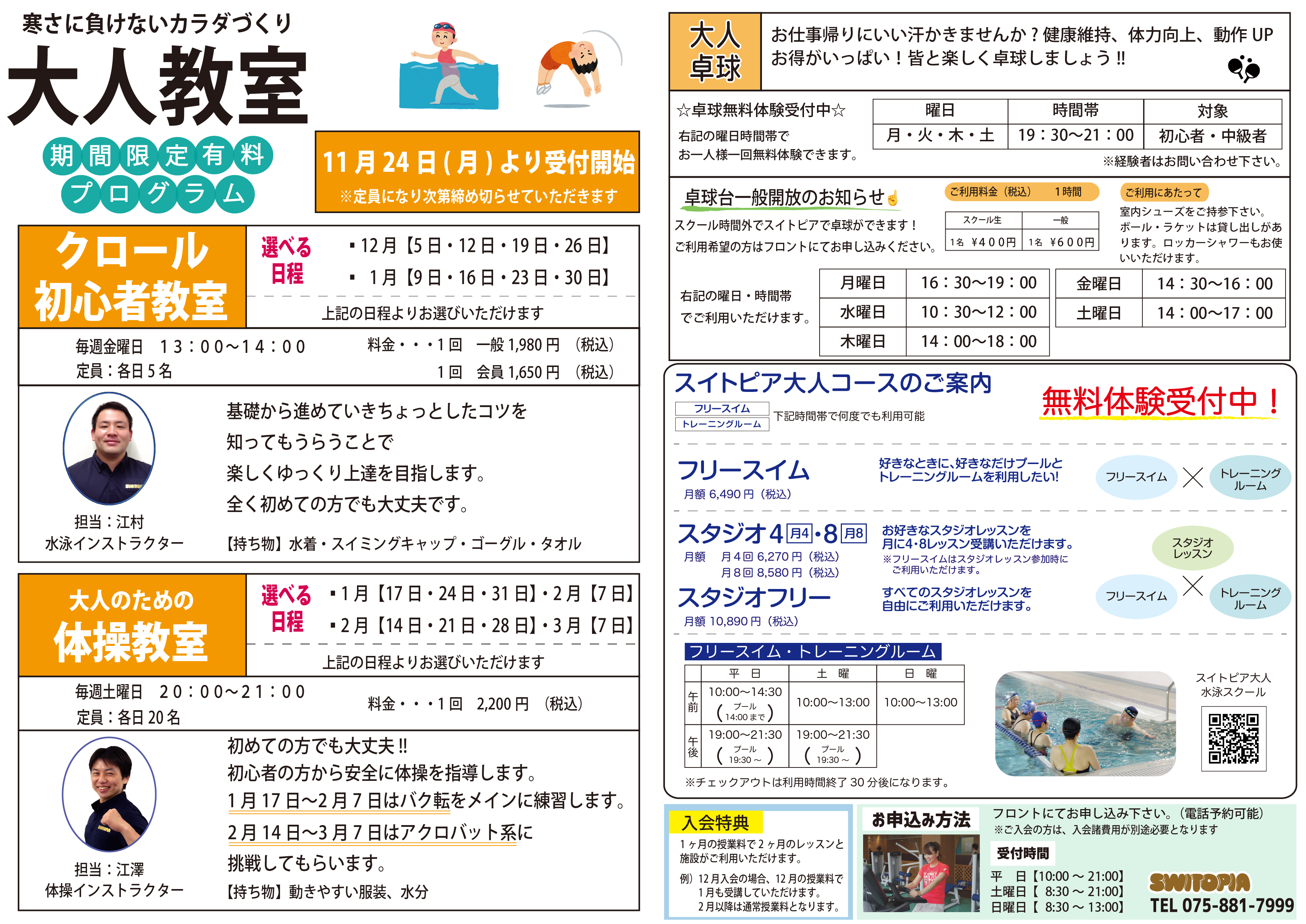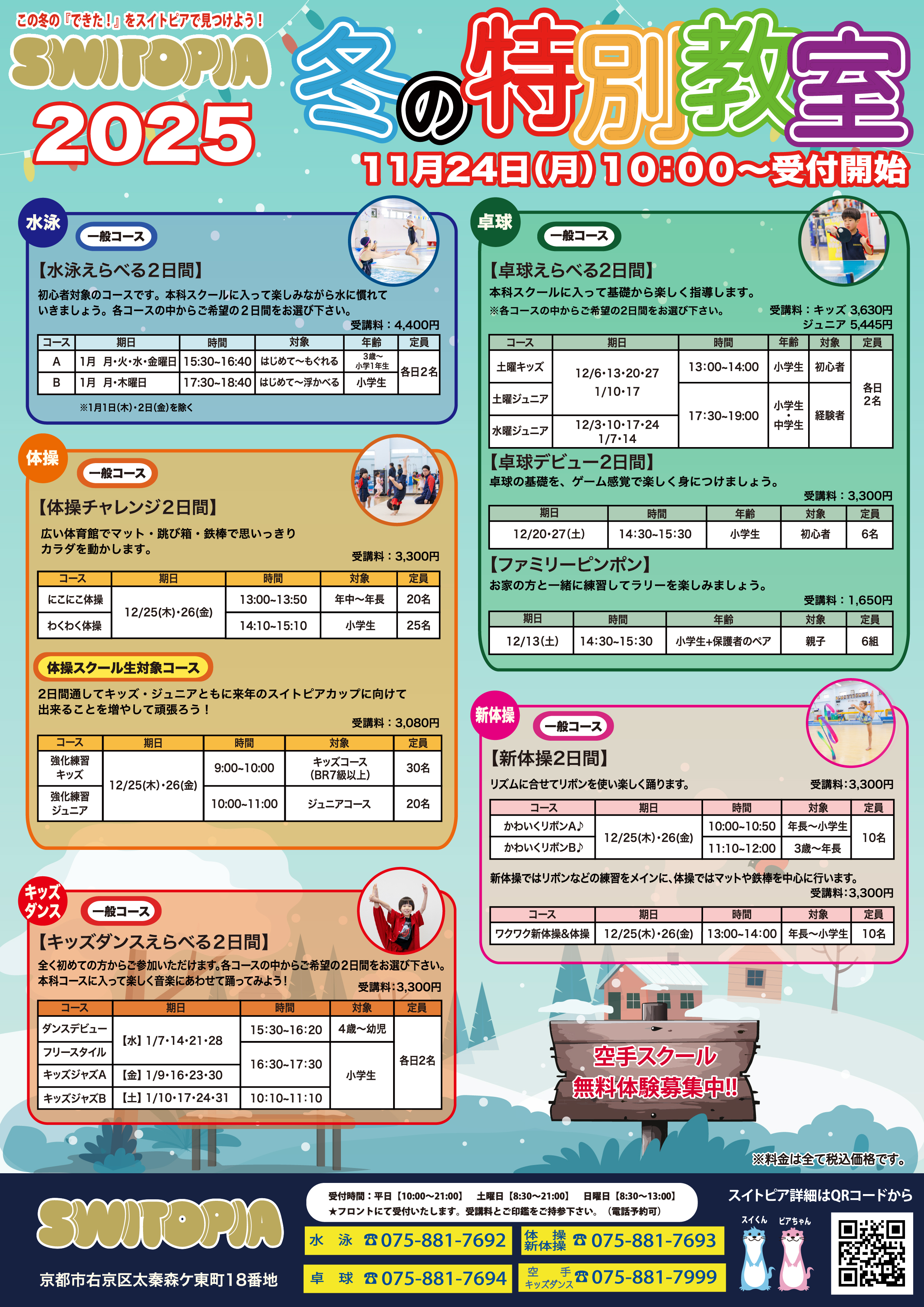 冬の特別教室のコース情報です!申込は来週11/24日(月)~となっております!皆様のご参加心よりお待ちしております。